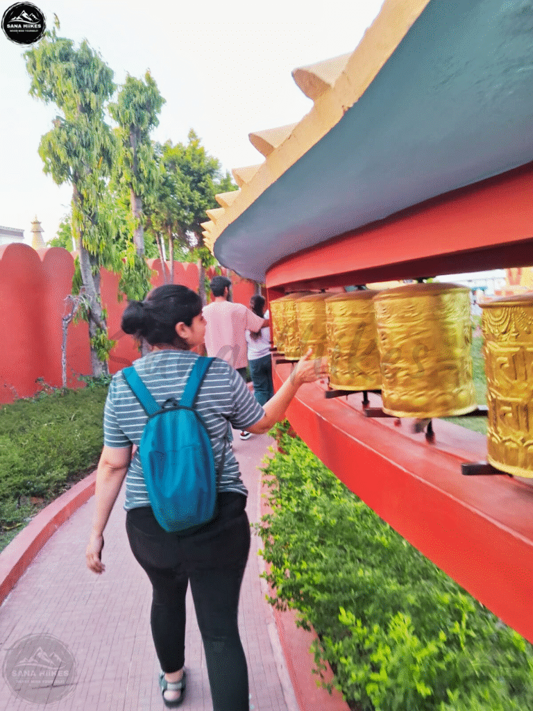 I visited Buddha Temple in Dehradun in June on a hot summer day. Believe me, being drenched in sweat and hot, humid weather made the day feel like boiling in hell. Reaching the gate of the place gave me a Tibetan vibe, which made me go with the flow. Peeping into each shop and restaurant, I landed at the entry gate of the Buddhist Temple. Once I entered, I was welcomed by the rows of prayer bells and the golden statue of Lord Buddha. Everyone was rolling the bells, clicking, and the gentle sound made the environment peaceful. After some time, the place became quiet, and the mild wind around made the environment peaceful. We also saw Buddhist monks and small children with maroon-robed monks busy with their daily routines silently. After spending some time and clicking with the giant Buddha statue, we took a walk around.
